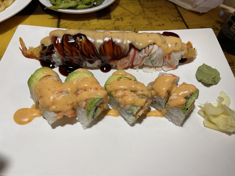 Shrimp tempura, avocado in, and spicy crab on top with delicious eel sauce.