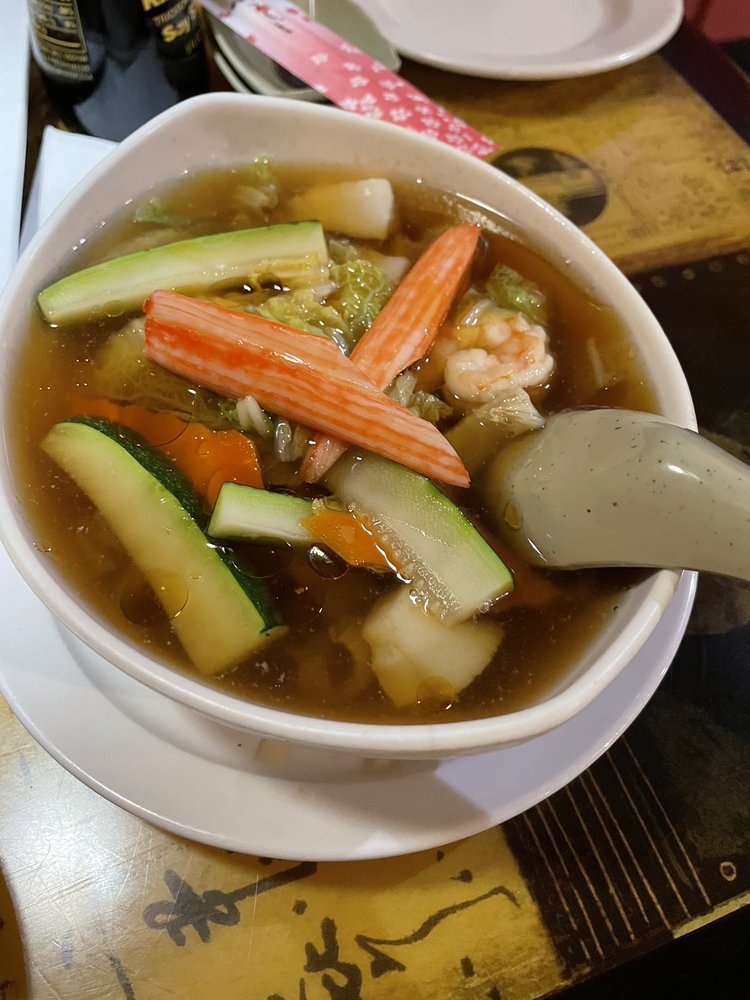 Delicious vegetable soup with tender shrimp, scallops and crabmeat.